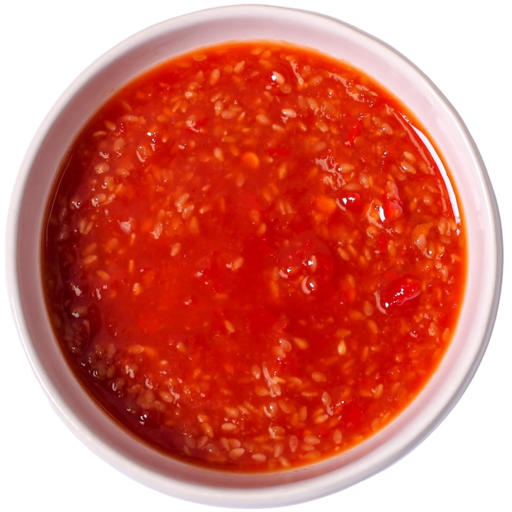 Składniki: soja 29%, woda, czosnek, cukier, czerwone chilli, destylowany ocet, sól, brązowy ryż, olej sojowy 1%, (soja, mąka pszenna, sól, woda), zagęszczacz: E1422, wzmacniacz smaku:E621.