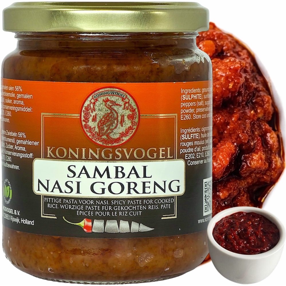Opis: Sos sambal nasi goreng w słoiczku o pojemności 260g firmy Koningsvogel. To specjalna odmiana sosu chilli sambal do smażonego ryżu o nazwie nasi goreng. Potrawie nadaje niesamowitego charakteru oraz smaku.