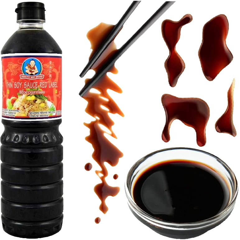 Opis: Sos sojowy jasny tajski premium red label w butelce 1000ml firmy Healthy Boy Brand. Główny składnik orientalnych potraw. Jest bardzo częstym dodatkiem smażonych mięs, zup, dipów do sushi, marynat i wielu innych azjatyckich potraw. Dość słony w smaku, przypomina popularną przyprawę magi. Ekonomiczny tajski sos sojowy jasny w dużej butelce.