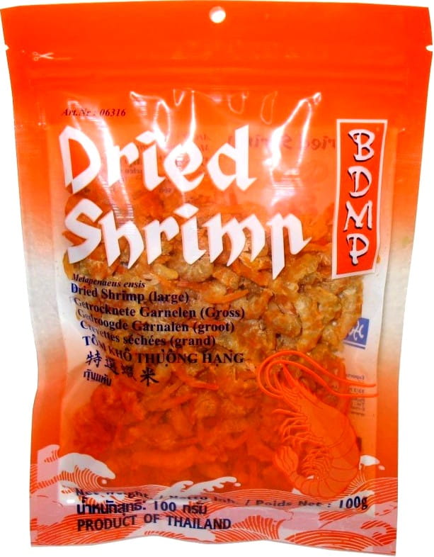 Opis: Duże suszone krewetki o rozmiarze M w opakowaniu 100g firmy Jefi. Bardzo często stosowane w kuchni azjatyckiej jako dodatek do dań, sosy, zup oraz dipów. Do wyprodukowania 100g suszonych krewetek, potrzebny jest 1kg krewetek. Krewetki można dodawać do potraw w postaci suszonej, albo zamoczyć je w wodzie wtedy zwiększą swoją objętość. Można je również utrzeć w moździerzu i wykorzystać jako posypka np. do smażonego makaronu.