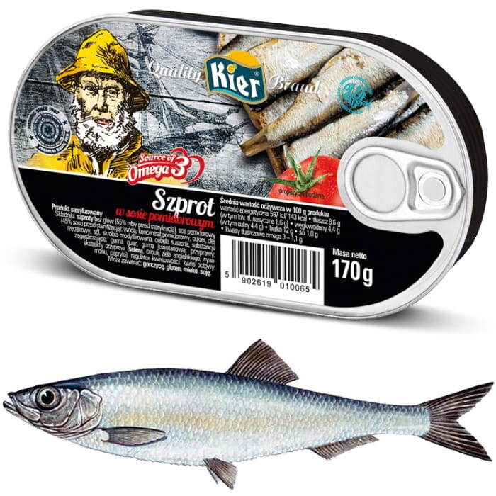 Opis: Szprot w sosie pomidorowym w opakowaniu o pojemności 300g, wyprodukowane przez firmę Kier.