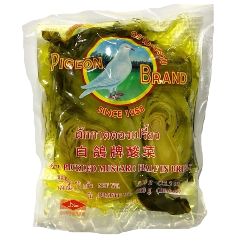 Opis: Tajskie piklowane kwaśne liście musztardowe w solance w opakowaniu o pojemności 350g marki Pigeon Brand. Tradycyjny produkt kuchni tajskiej, który jest popularny zarówno w Tajlandii, jak i w innych krajach Azji Południowo-Wschodniej. Produkt ten jest wytwarzany z liści musztardowca, które są starannie wybierane, a następnie poddawane procesowi fermentacji w solance. Piklowane liście musztardowca w solance marki Pigeon Brand są doskonałym sposobem na dodanie autentycznego smaku tajskiej kuchni do domowych potraw.