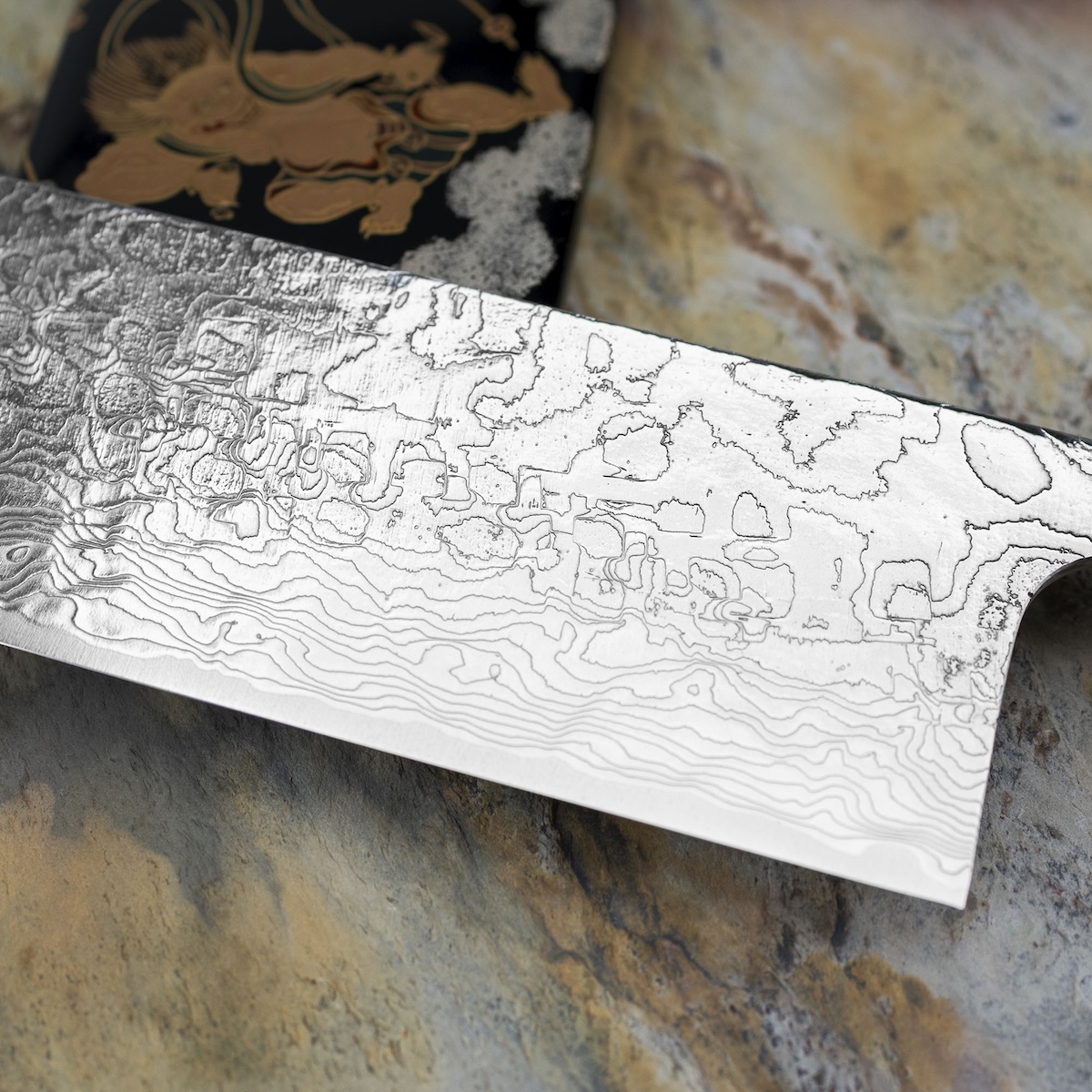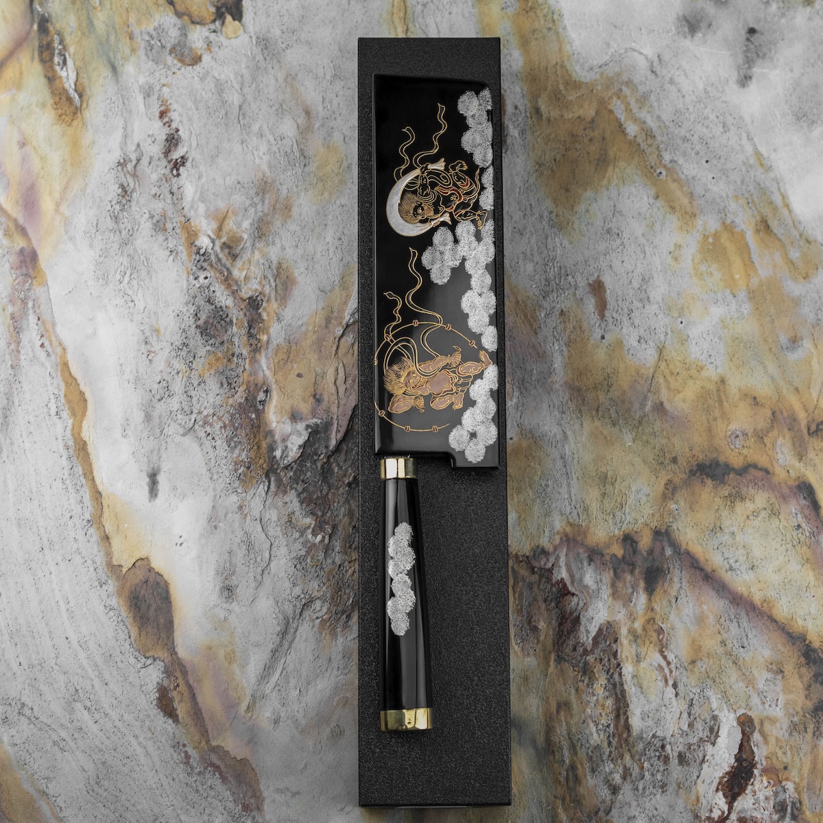Znaczna szerokość klingi ułatwia prowadzenie noża oraz wygodne zgarnianie pokrojonych składników bezpośrednio do naczynia. Model z artystycznej serii Art Fujin Raijin wyróżnia się subtelnym, falistym wzorem na klindze oraz ręcznie malowaną sayą inspirowaną japońskimi bóstwami wiatru i burzy – Fujin i Raijin. Każdy egzemplarz powstaje w procesie ręcznego kucia, dzięki czemu jest unikatowym dziełem japońskiego rzemiosła.