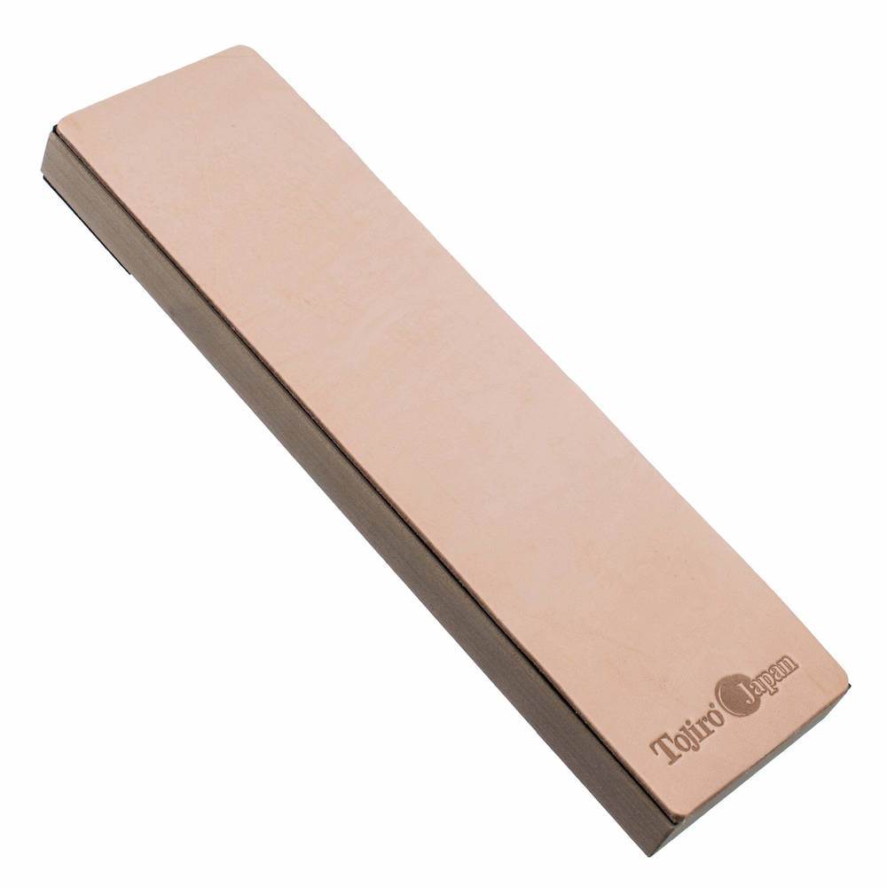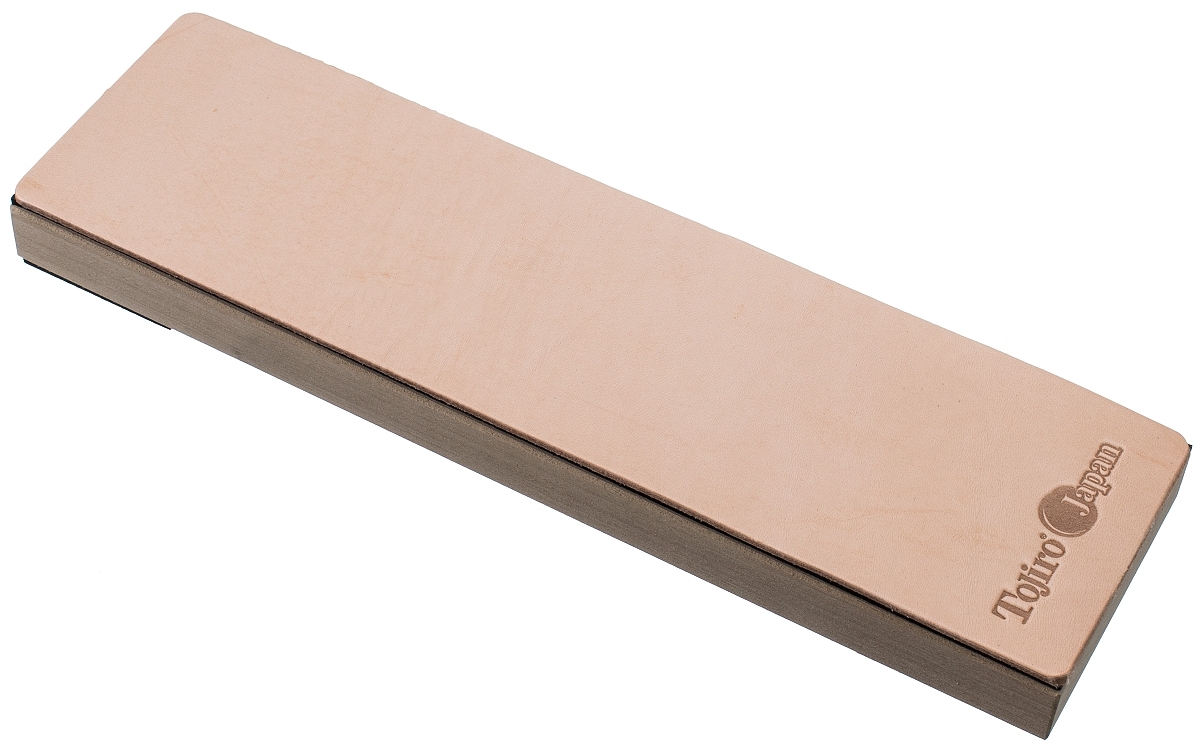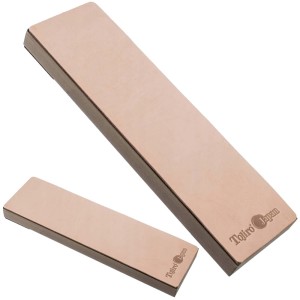 Opis: W celu osiągnięcia płynniejszego odczucia krojenia, warto pomyśleć o tak zwanym “stroppingu”, czyli końcowym wyrównywaniu i polerowaniu krawędzi tnącej na miękkim materiale, takim jak skóra. Jedną z często spotykanych metod jest skórzany pasek, przymocowany do ściany lub drzwi, a firma Tojiro zaproponowała wygodniejszą opcję, czyli „skórzany kamień”.