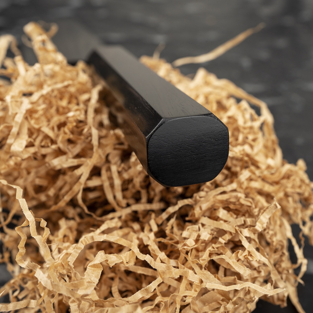 Oktagonalna rękojeść z eleganckiego drewna hebanowego zapewnia pewny chwyt, bardzo dobre wyważenie oraz wysoki komfort pracy. Klasyczny, ośmiokątny kształt sprawia, że nóż jest wygodny zarówno dla osób prawo-, jak i leworęcznych, podkreślając prestiżowy charakter serii.