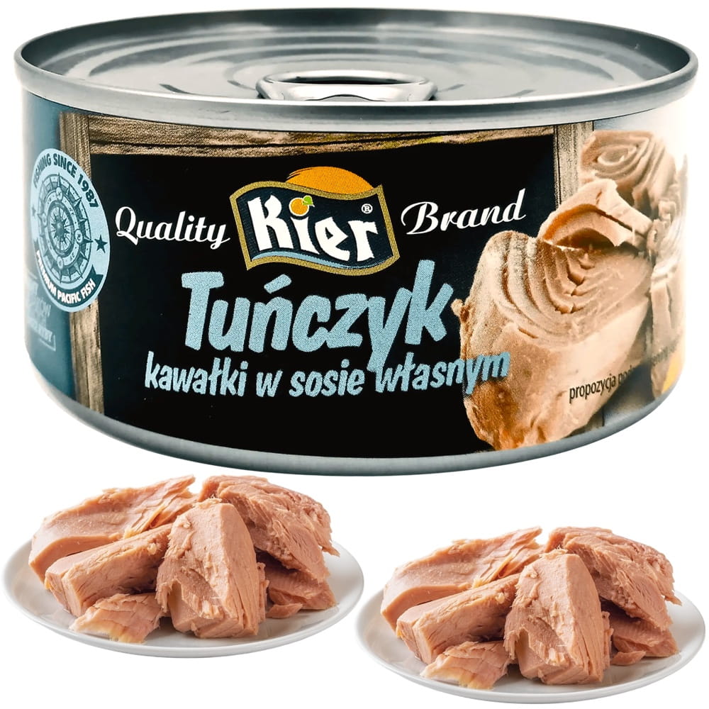 Opis: Tuńczyk w sosie własnym w formie kawałków w puszce o pojemności 170g, wyprodukowane przez firmę Kier.