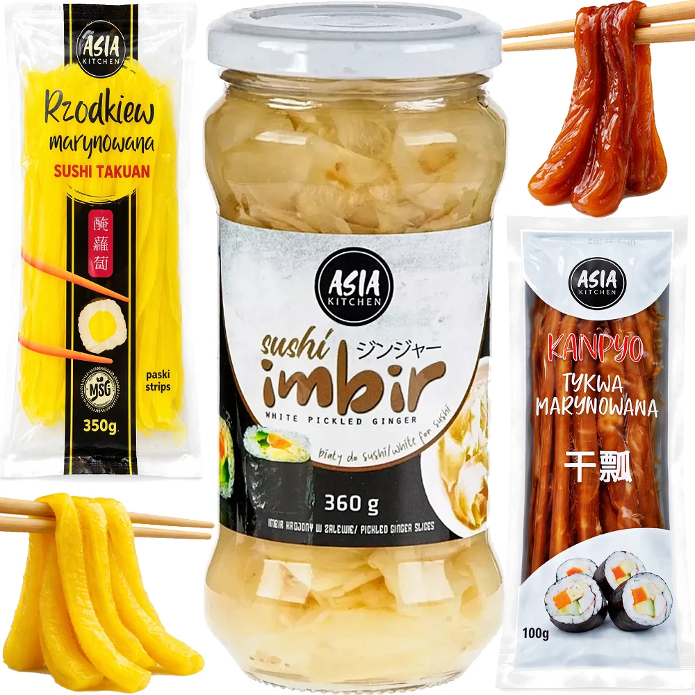 ZESTAW 3 DODATKI DO SUSHI Imbir Biały 360g + Rzodkiew Oshinko 350g + Tykwa Kampyo 100g ASIA KITCHEN