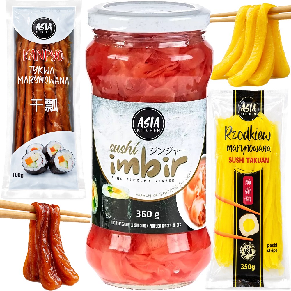 ZESTAW 3 DODATKI DO SUSHI Imbir Różowy 360g + Rzodkiew Oshinko 350g + Tykwa Kampyo 100g ASIA KITCHEN
