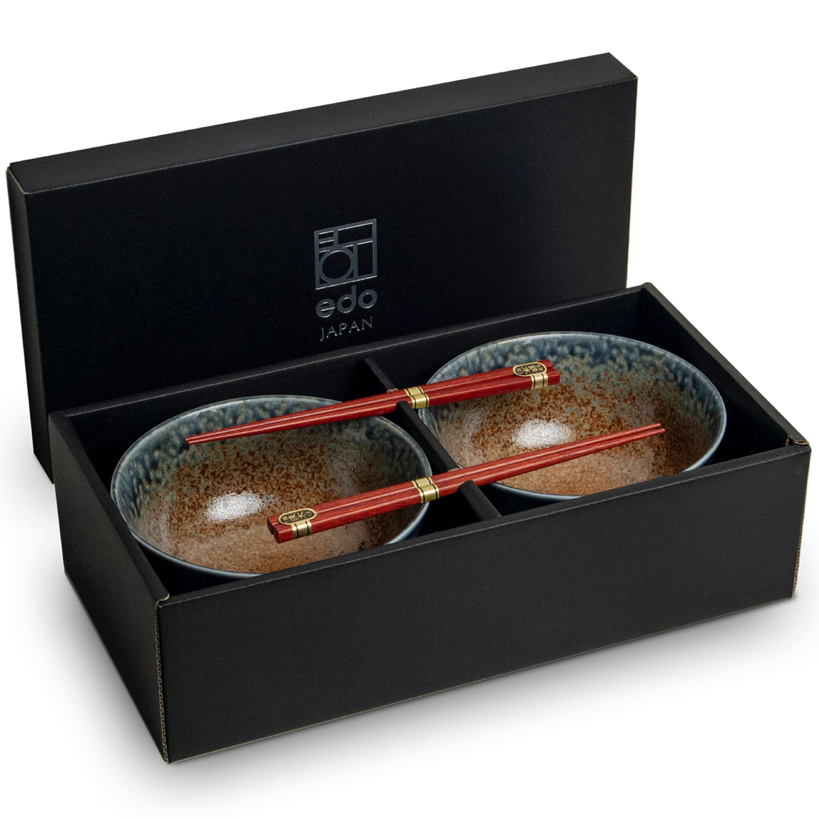 Zestaw Brązowo Niebieskich Misek 17cm KI Do Makaronu Zupy Udon z Pałeczkami EDO JAPAN