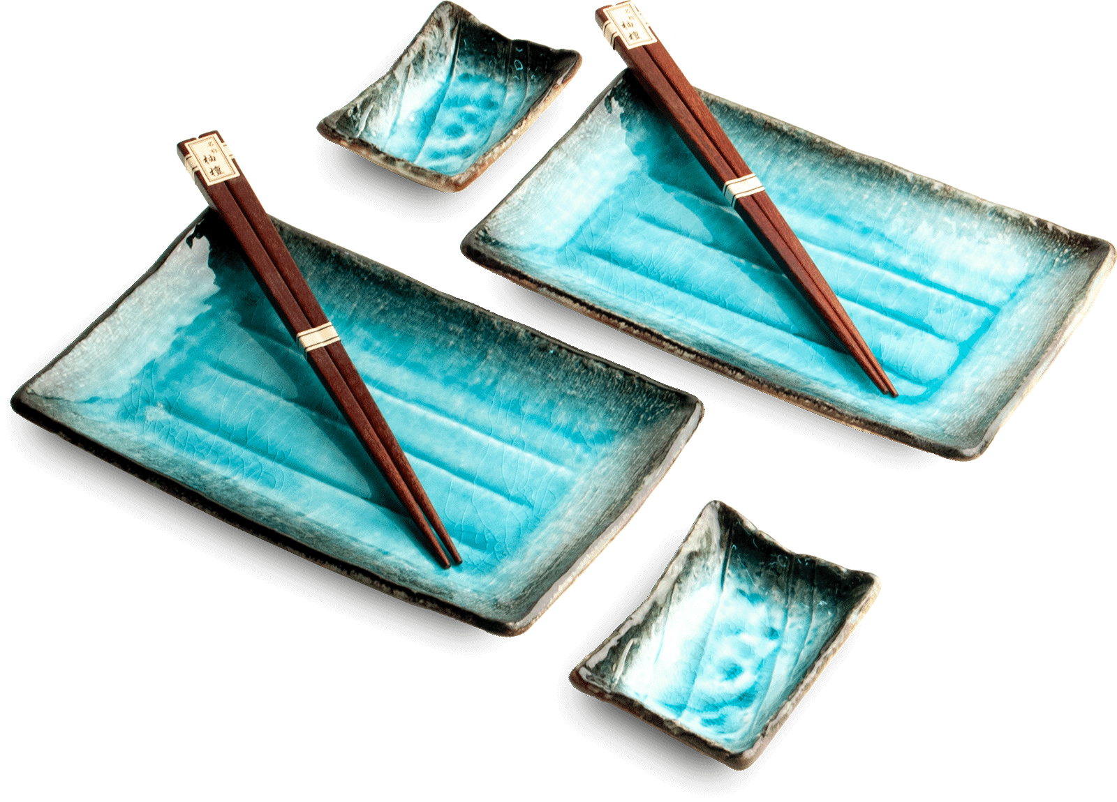 W skład zestawu wchodzą 2 talerzyki na sushi, 2 miseczki na sos sojowy, wasabi lub imbir oraz 2 pary eleganckich ciemnobrązowych pałeczek, które pozwalają w pełni celebrować smak japońskiej kuchni w autentycznym stylu.