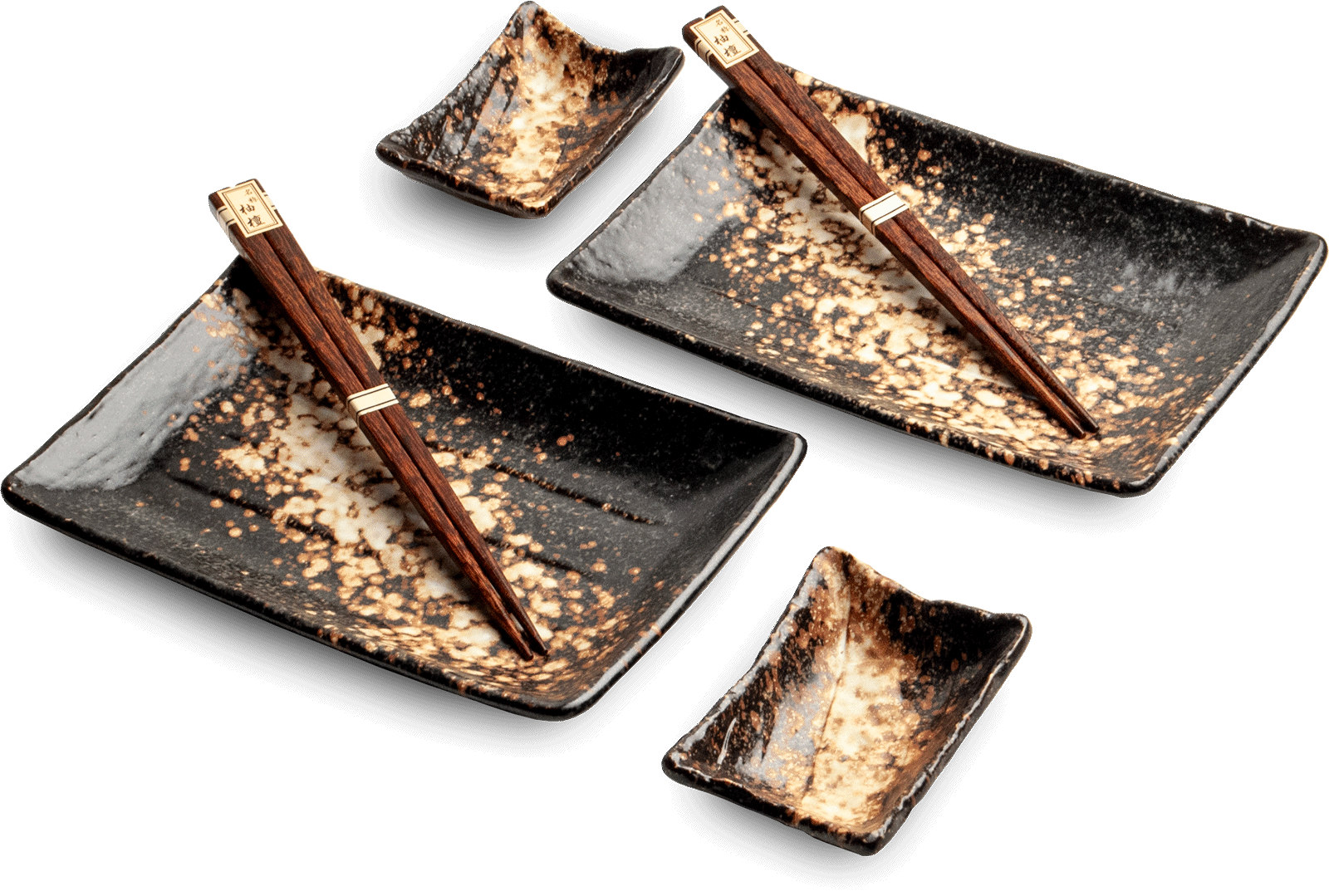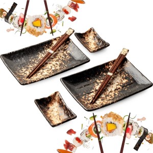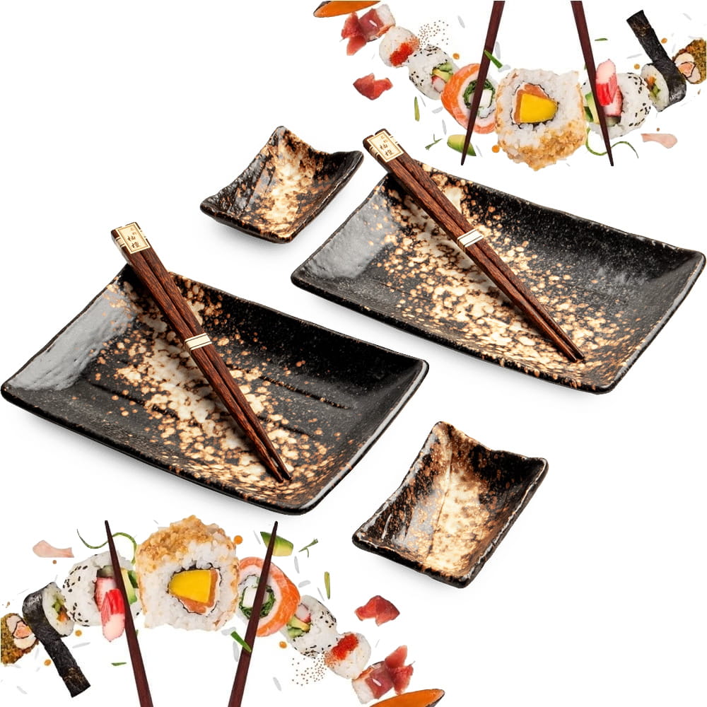 W skład zestawu wchodzą 2 talerzyki na sushi, 2 miseczki na sos sojowy, wasabi lub imbir oraz 2 pary eleganckich ciemnobrązowych pałeczek. Dzięki temu kompletowi każdy posiłek staje się wyjątkową celebracją smaków i harmonii – zarówno podczas codziennych chwil, jak i spotkań w gronie najbliższych.