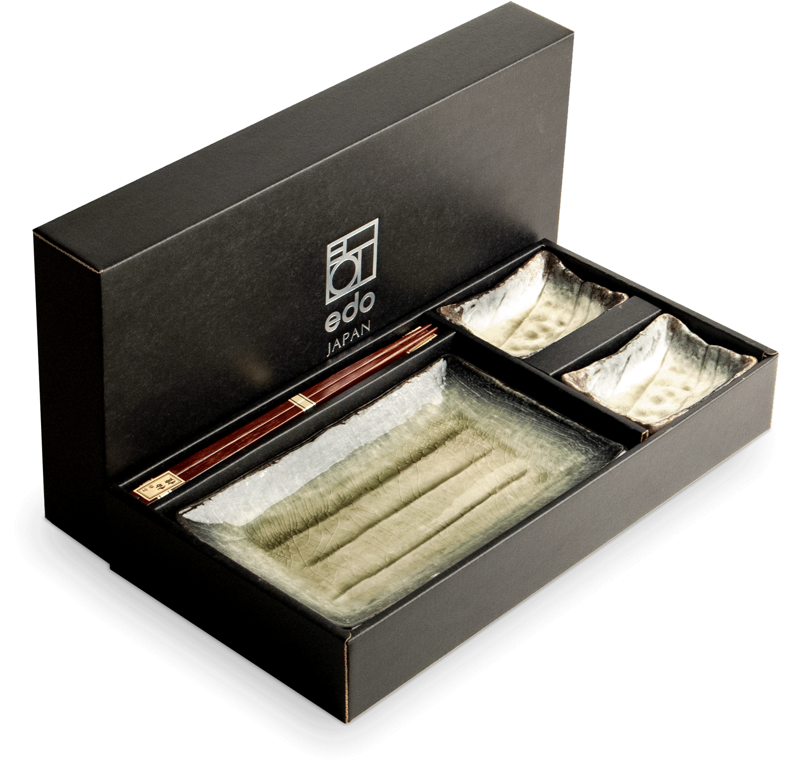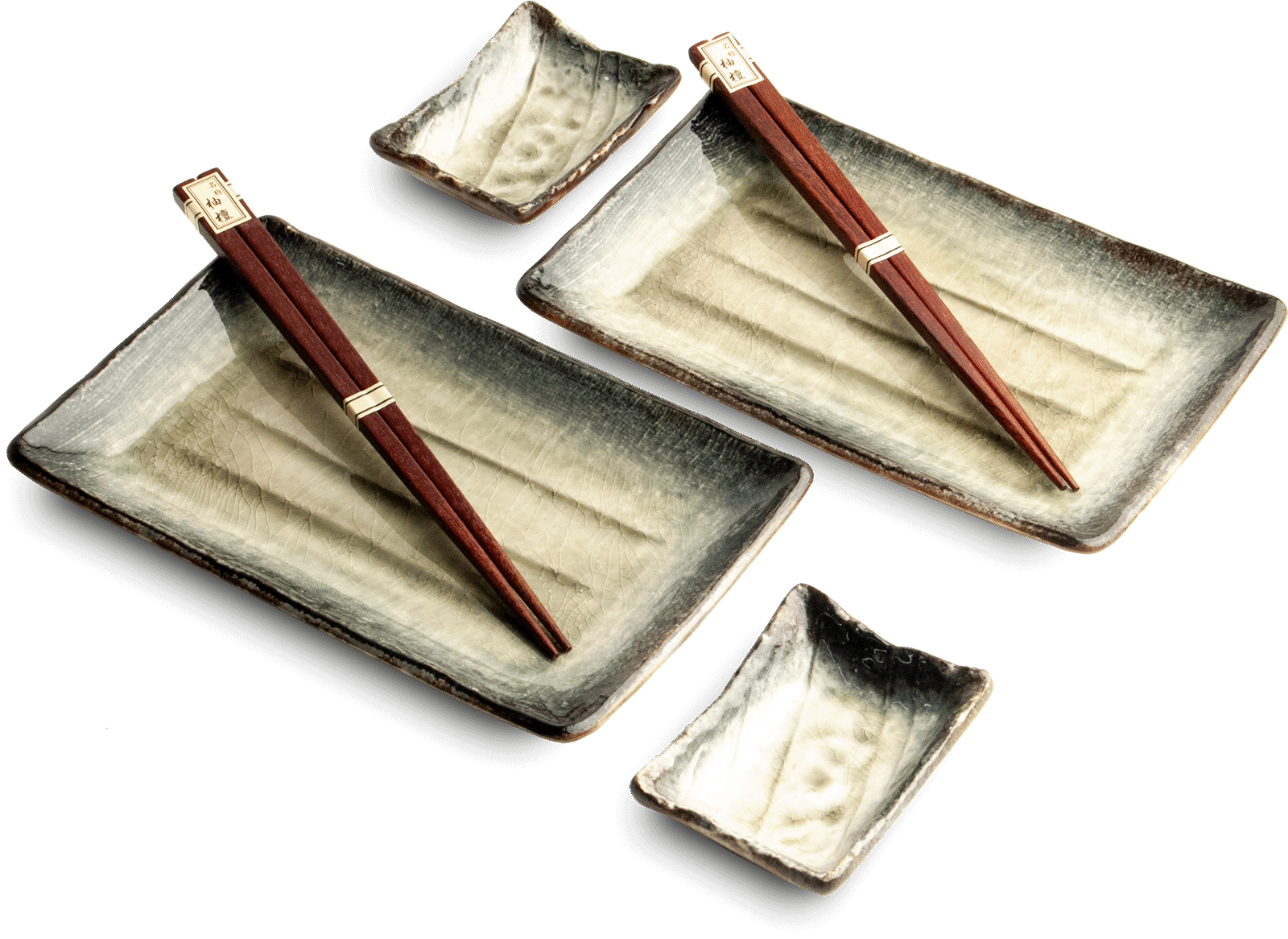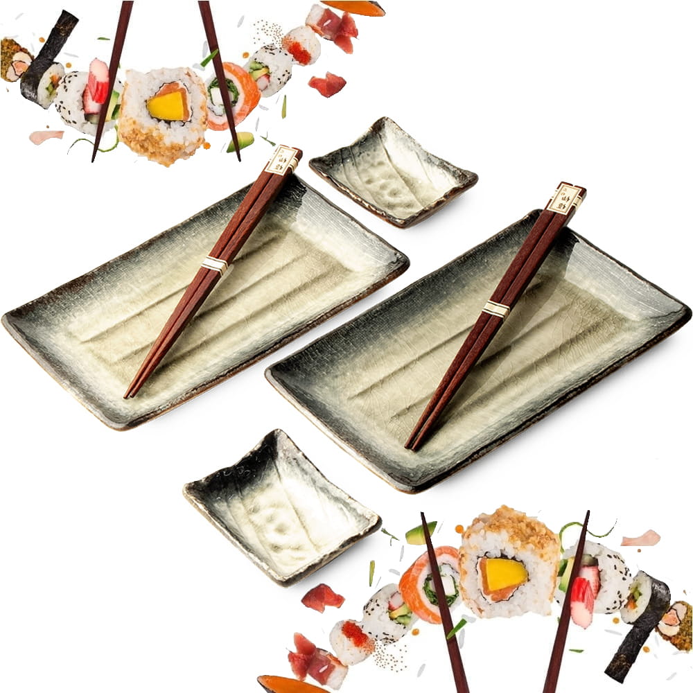 W skład zestawu wchodzą 2 talerzyki na sushi, 2 miseczki na sos sojowy, wasabi lub imbir oraz 2 pary eleganckich ciemno-brązowych pałeczek, dzięki którym można w pełni celebrować smak japońskich potraw w autentycznej formie.
