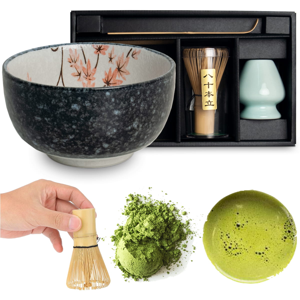 Opis: Oryginalny jasny japoński zestaw liść klonu do przygotowania herbaty matcha. W skład zestawu wchodzą cztery niezbędne produkty: