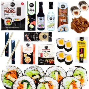 - kompletny zestaw 11 elementów – w tym ryż do sushi, algi nori, sos sojowy, ocet ryżowy, przyprawy oraz mata do zawijania