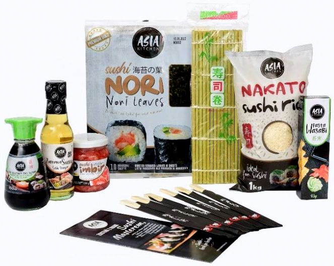 - pełen zestaw produktów spożywczych i akcesoriów – ryż, algi nori, ocet ryżowy, sos sojowy, imbir marynowany, wasabi, mata bambusowa i sushi roller