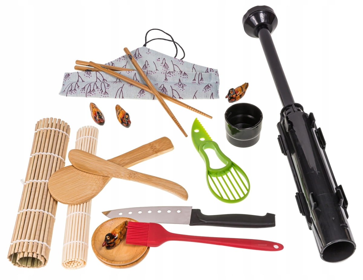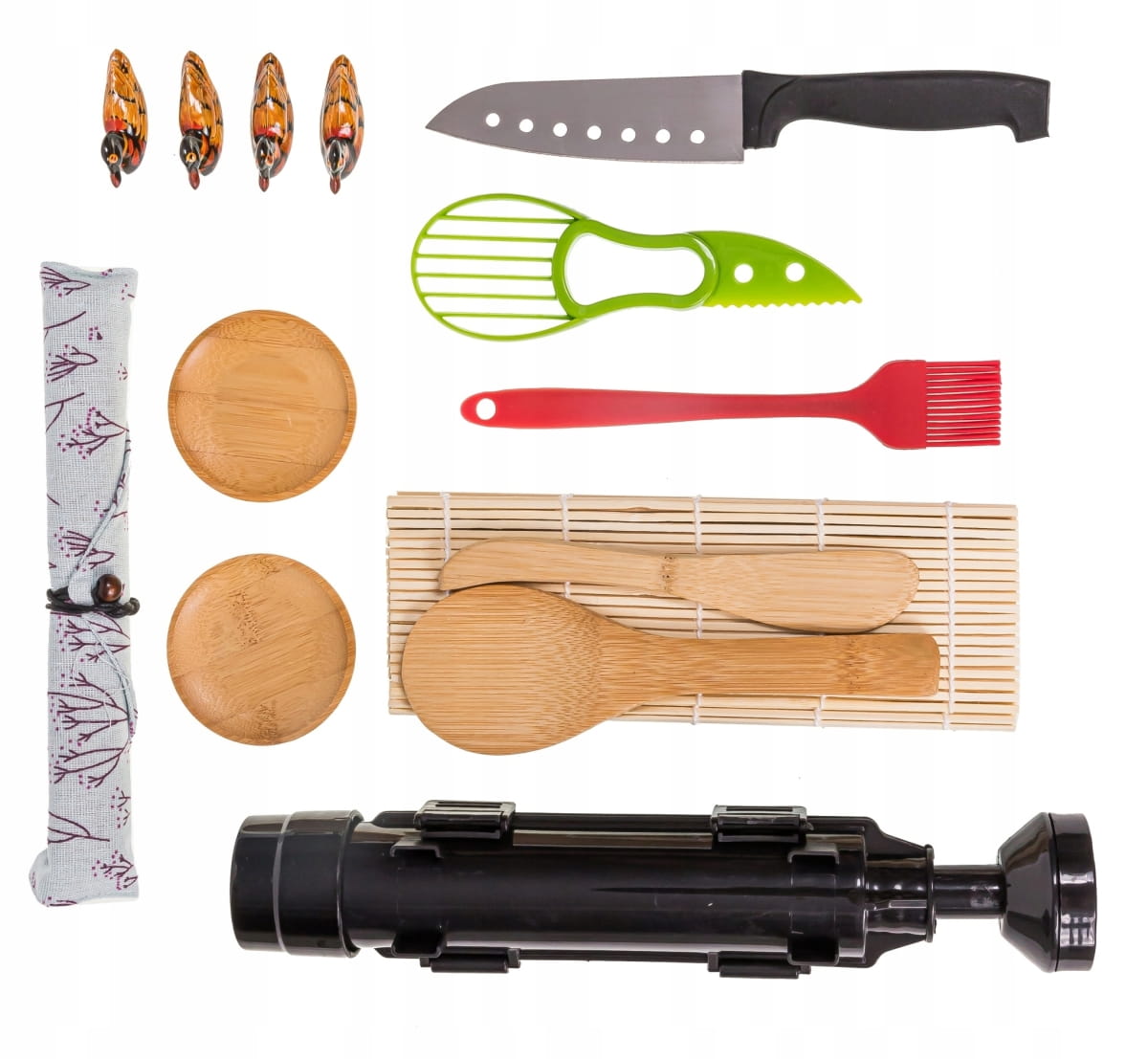 - pełny zestaw akcesoriów – zawiera roller, matę bambusową, nóż i pałeczki