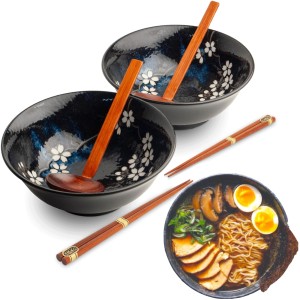 W skład zestawu wchodzą dwie duże miseczki z porcelany, idealne do serwowania aromatycznej zupy ramen, pałeczki oraz eleganckie chochelki w ciemnym, głębokim odcieniu brązu. Całość tworzy doskonałą kompozycję, która łączy funkcjonalność z estetyką.