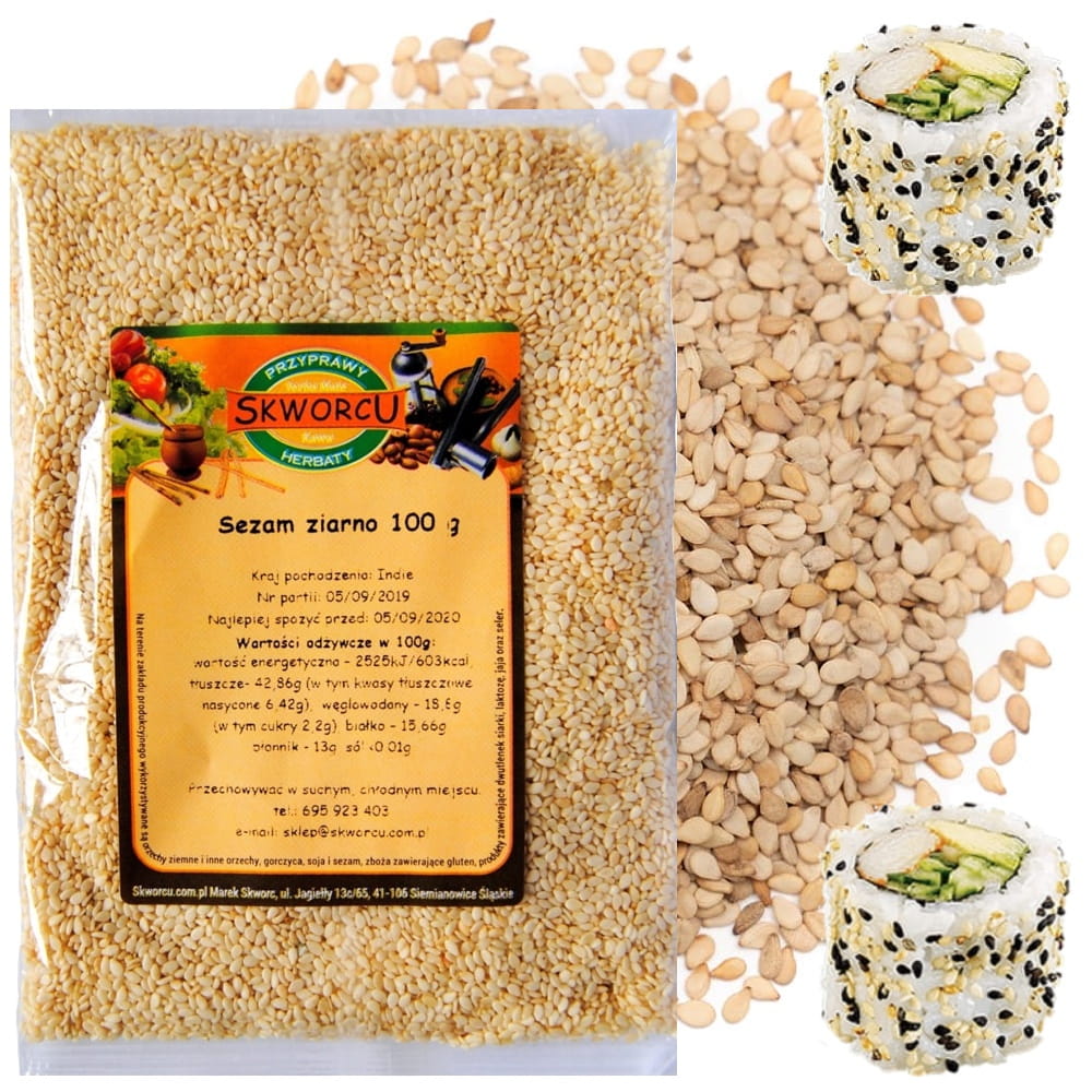 Opis: Sezam biały posypka do sushi i sałatek w opakowaniu o pojemności 100g firmy SKWORCU.