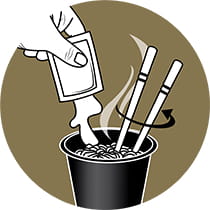 | 1. Otwórz kubek, wyjmij saszetkę z sosem. Zalej makaron gorącą wodą. |